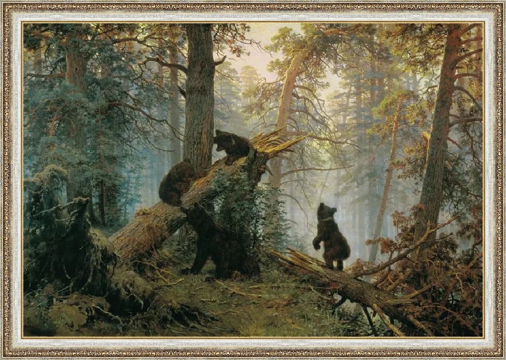 Одним из классических примеров грамотного использования композиционных принципов является работа Ивана Шишкина «Утро в сосновом лесу». В этой картине художник применяет правило третей, размещая медведей в центральном сегменте сетки, а деревья совмещая с вертикальными линиями. Горизонт при этом совпадает с нижней линией сетки, что создает устойчивое и сбалансированное восприятие сцены. Такой подход демонстрирует важность точного расположения ключевых элементов для создания гармоничной композиции.