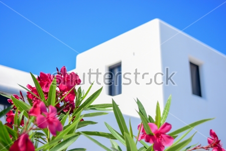 Картина Розовые цветы олеандра на фоне голубого неба и белоснежного здания