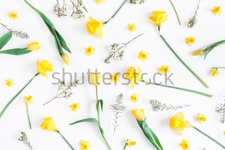 Картина Весенняя цветочная композиция с жёлтыми нарциссами и тюльпанами на белом фоне