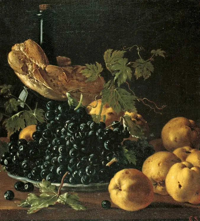 Картина Натюрморт с хлебом, яблоками, виноградом и бутылкой Мелендес Луис