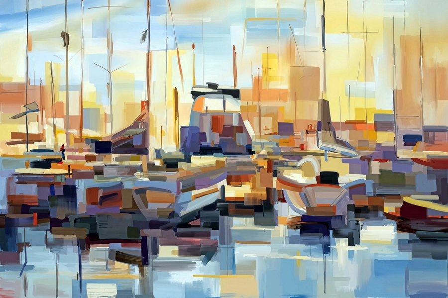 Aртикул 11954DВ нашей компании Вы можете заказать картину "Причал с парусниками в стиле кубизм" .