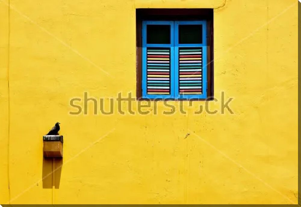 Картина маслом Яркие голубые ставни на яркой жёлтой стене с птицей