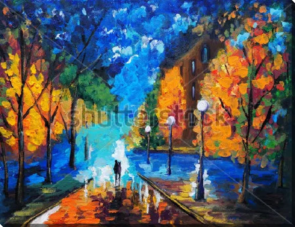 Картина маслом Освещённая фонарями осенняя аллея после дождя