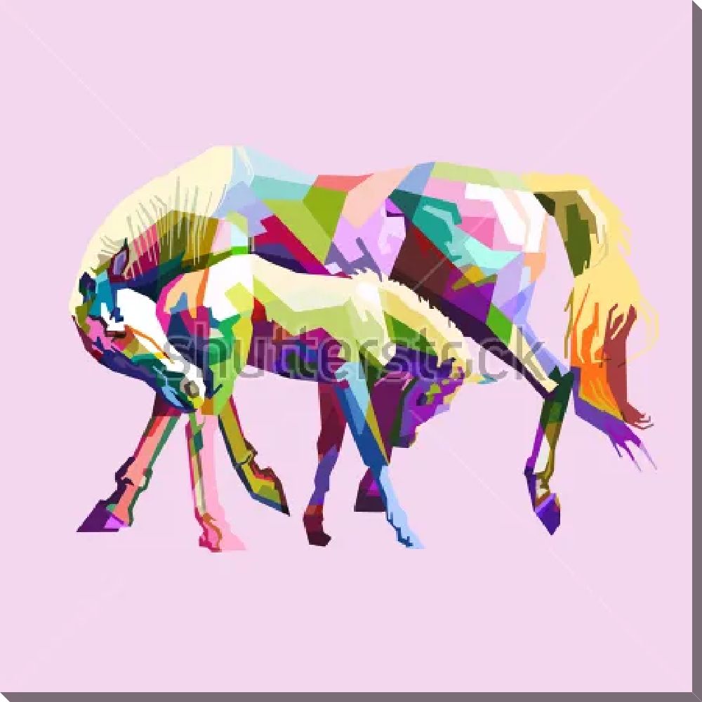 Картина маслом Разноцветная лошадь с жеребёнком на светло-сиреневом фоне в стиле поп-арт