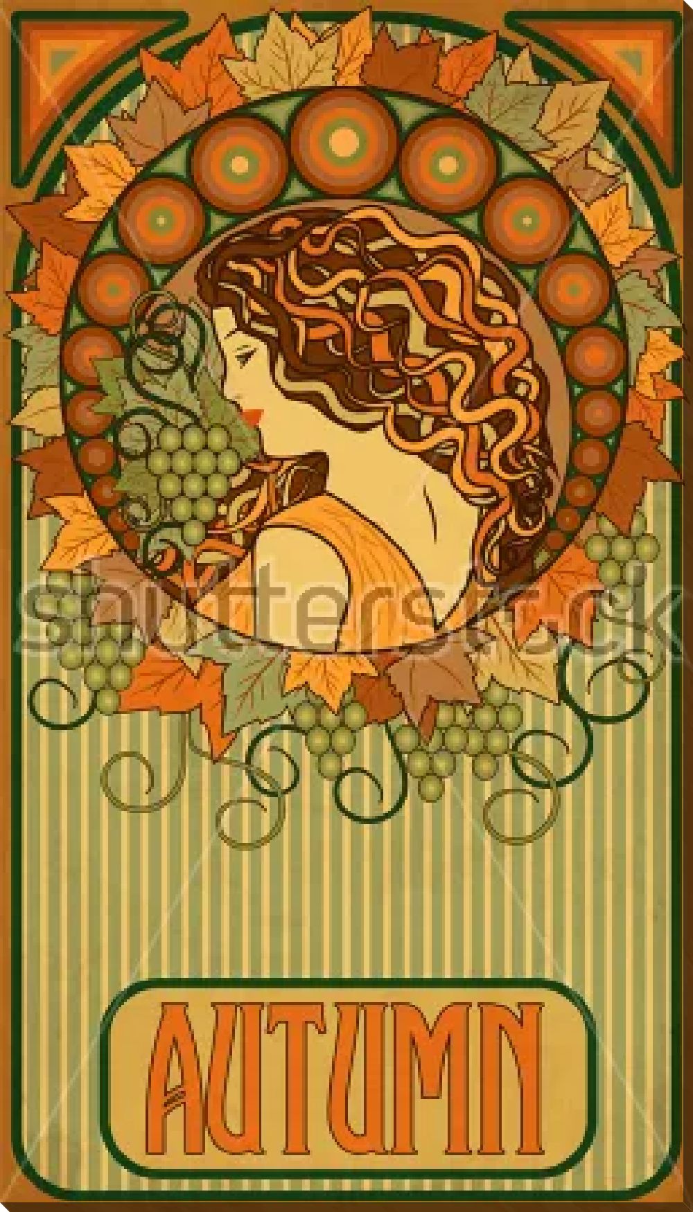 Картина маслом Красивый плакат в стиле арт-деко с девушкой, символизирующей осень, в окружении винограда и кругов