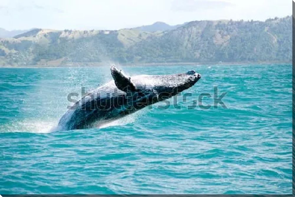 Картина маслом Горбатый кит выпрыгивает спиной из воды на фоне красивых горных хребтов
