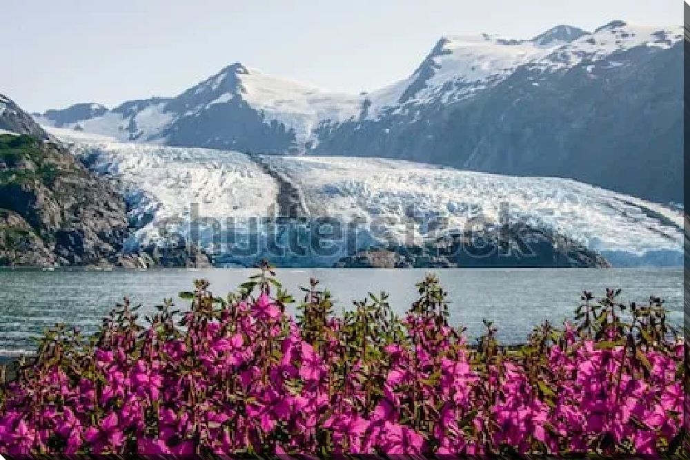 Картина маслом Великолепный вид на ледник в горах Чугач вдоль озера Портедж на фоне цветущего иван-чая (Аляска)
