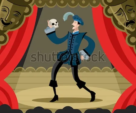 Картина маслом Иллюстрация с монологом Гамлета на театральной сцене, декорированной масками и красным занавесом