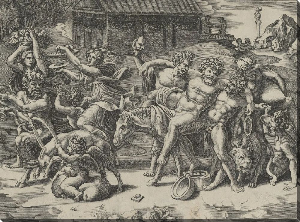Картина маслом Процессия Силена которого везут на осле предваряется вакханалией играющей на цимбалах и других фигурах Романо Джулио