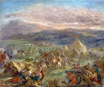 Aртикул 85172D Делакруа ЭженВ нашем интернет-магазине Вы можете заказать модульную картину "Ботзарис застает врасплох турецкий лагерь и падает, получив смертельное ранение" Делакруа Эжен.