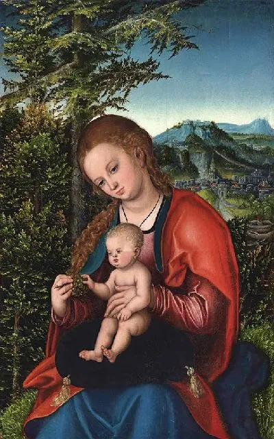 Модульная картина Мадонна с младенцем на фоне пейзажа Кранах Лукас Старший