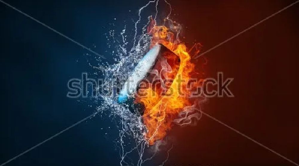 Плакат Хоккейная шайба в окружении стихий огня, воды и электрических разрядов
