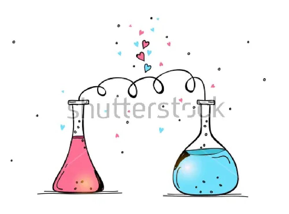 Плакат Забавная иллюстрация на тему химии и магии любви - колбочки с реагентами на фоне сердечек
