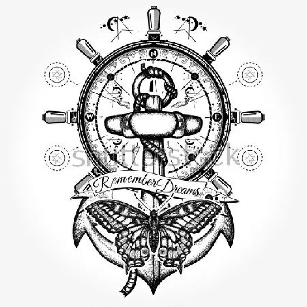 Плакат Коллаж на тему морских путешествий с якорем, штурвалом, компасом, бабочкой и надписью - следуй за мечтой