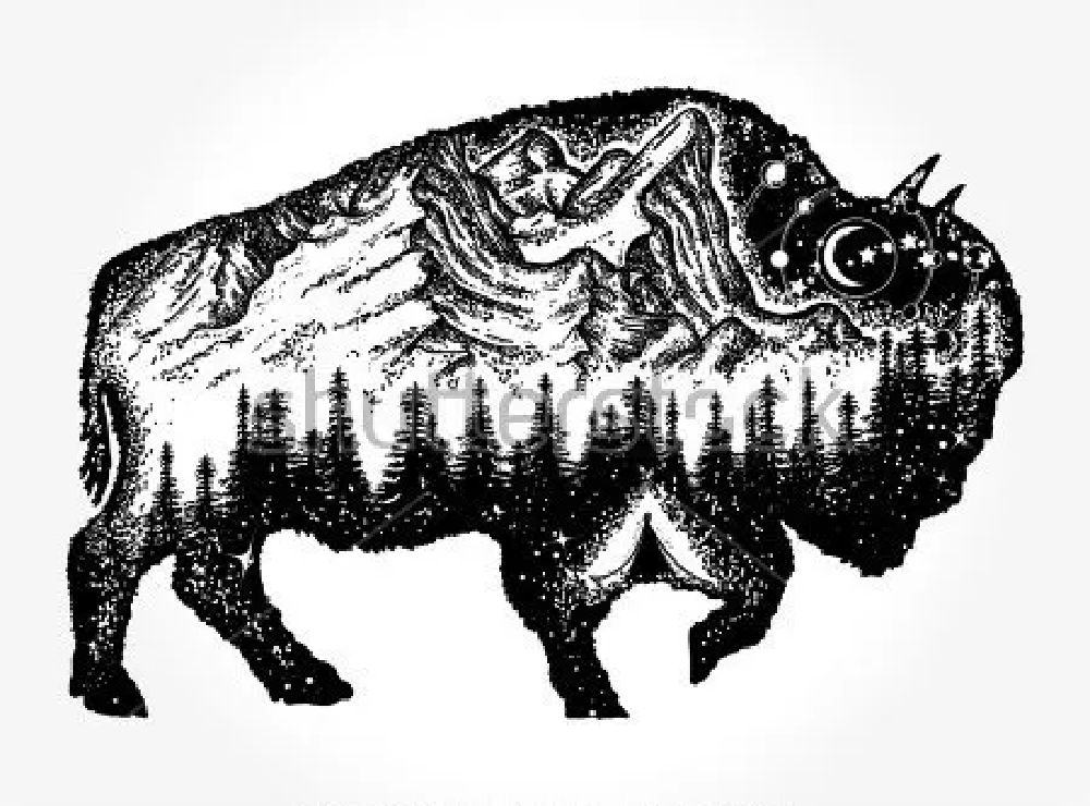 Aртикул 11704065402DВ нашей компании Вы можете купить плакат "Чёрно-белая иллюстрация ночного пейзажа с лесом и горами в силуэте зубра" по цене от 590 руб.