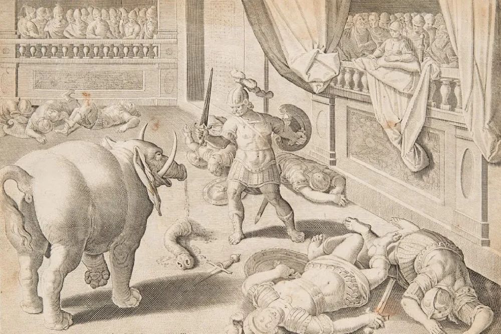 Плакат Римский солдат, сражающийся с одним из слонов Ганнибала, пл. Ян ван дер Страт