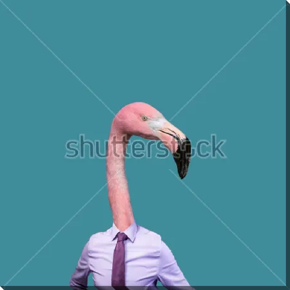Постер "Коллаж с головой розового фламинго в сиреневой рубашке и галстуком на синем фоне" станет прекрасным украшением Вашего интерьера и отлично будет смотреться на стене любого помещения: от жилой комнаты или спальни до офиса и коммерческого пространства.