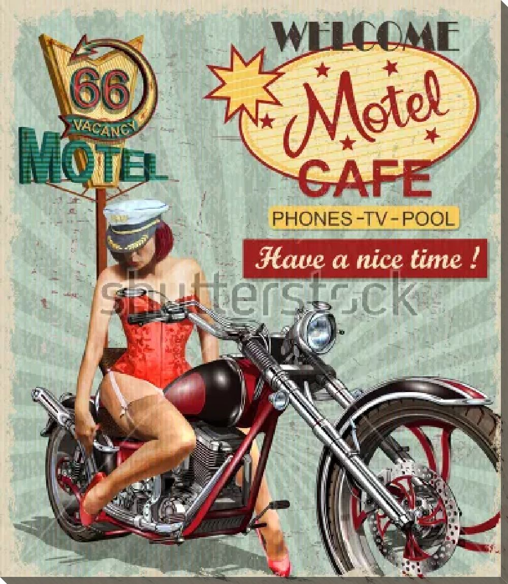 Aртикул 111009493971DВ нашей компании Вы можете купить постер "Яркий рекламный плакат отеля в винтажном стиле - с девушкой на мотоцикле и красочными слоганами" по цене от 590 руб.