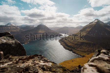 Постер Великолепный вид на живописные фьорды Фарерских островов в солнечный весенний день (Дания)