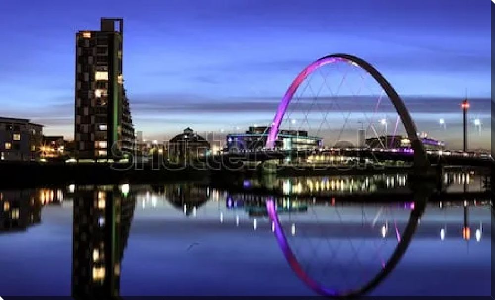 Постер "Панорама современной части ночного Глазго с красивым полукруглым мостом через реку Клайд (Шотландия)" станет прекрасным украшением Вашего интерьера и отлично будет смотреться на стене любого помещения: от жилой комнаты или спальни до офиса и коммерческого пространства.