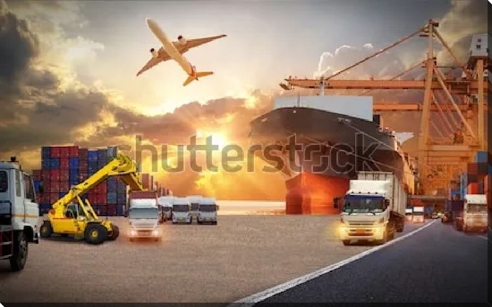 Постер Коллаж на тему бизнес-логистики и перевозок контейнерных грузов на различном транспорте
