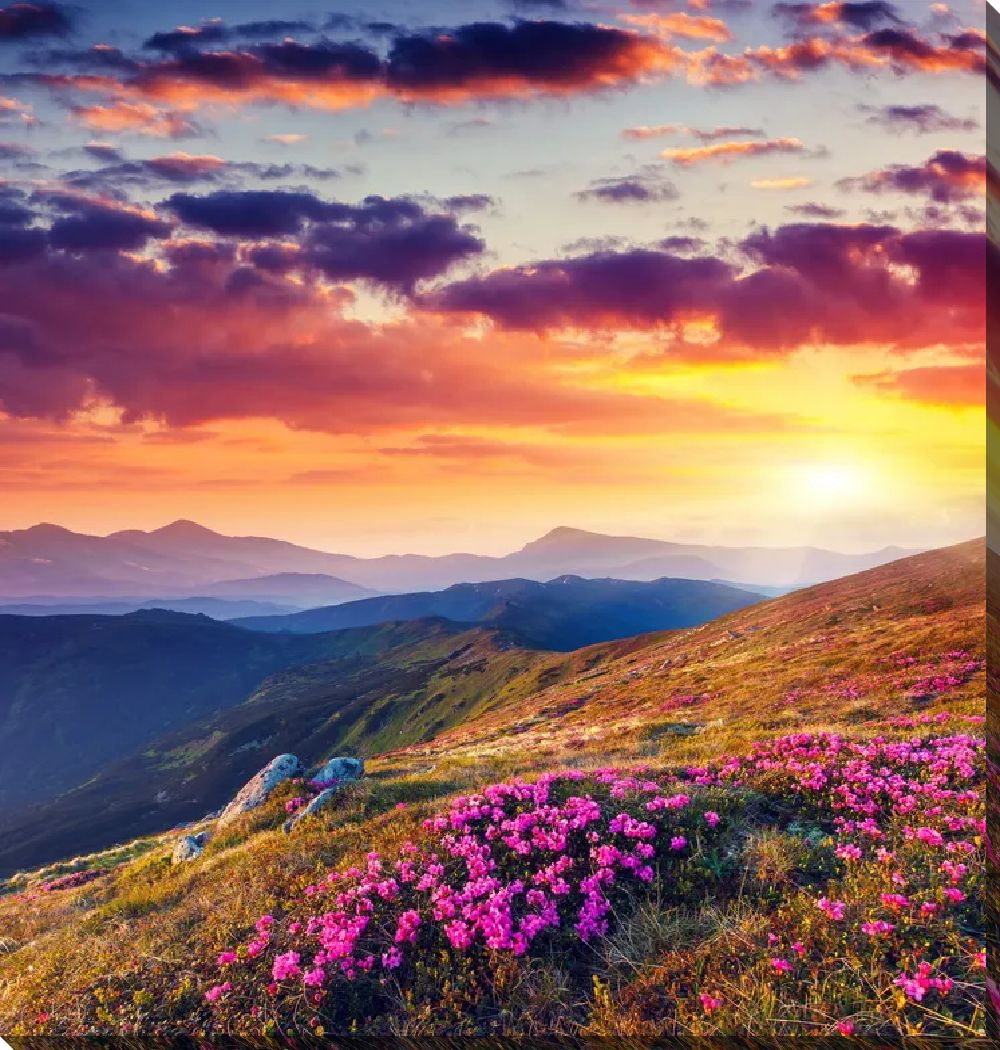 Aртикул 91397DВ нашей компании Вы можете купить постер "Цветы в горах на закате (Flowers in the mountains at sunset)" по цене от 590 руб.